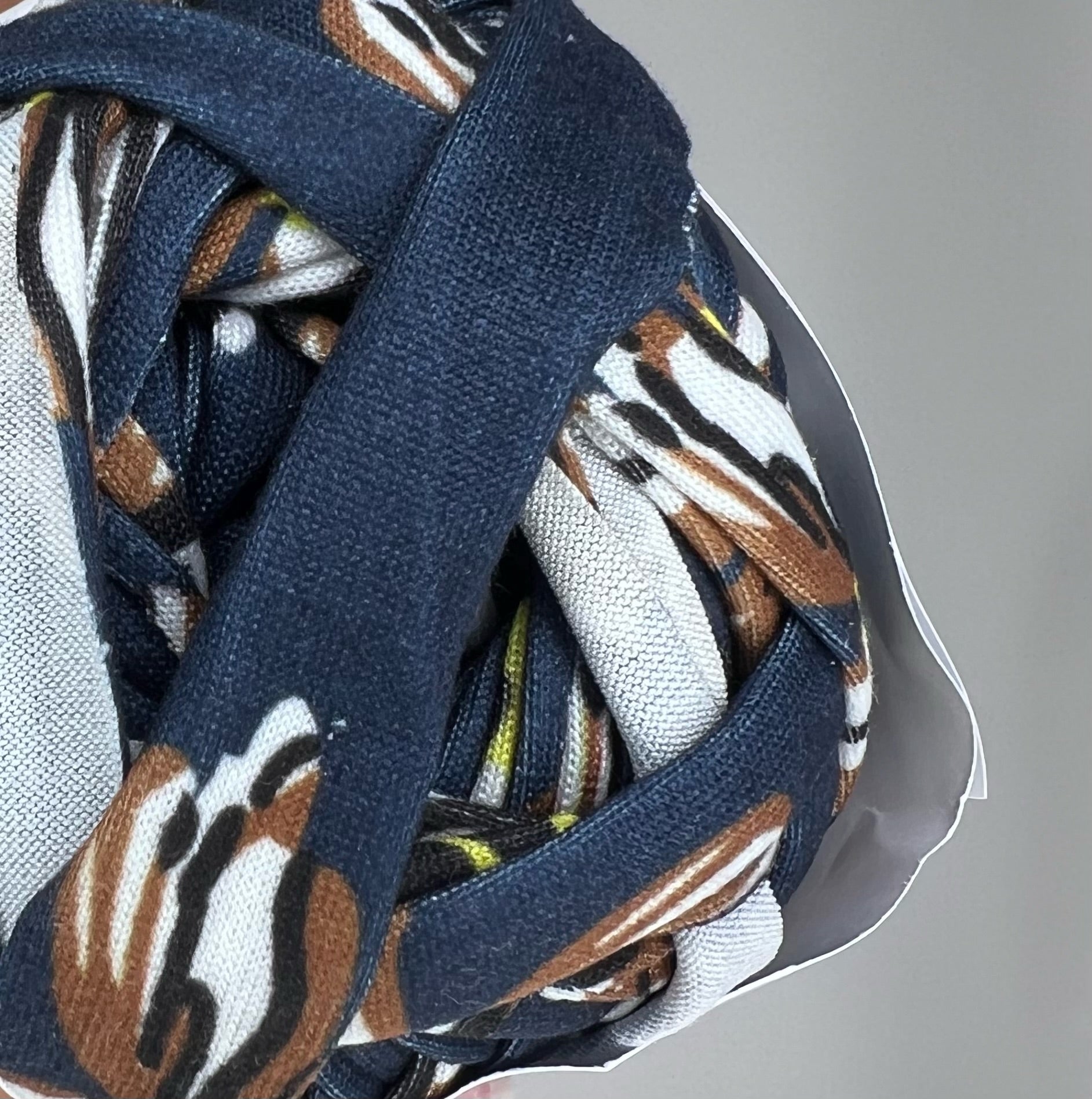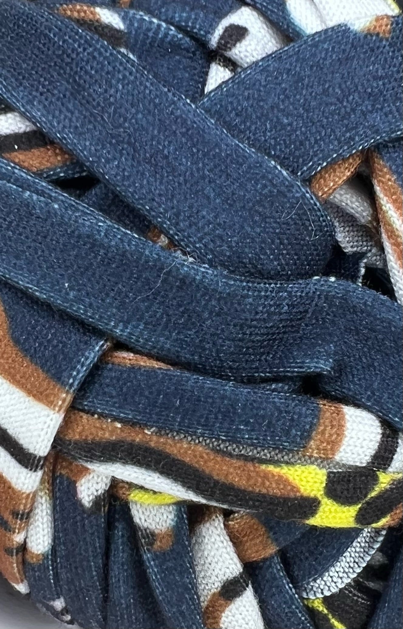 A striking T-shirt yarn featuring a blend of deep blue with a vibrant mosaic pattern in brown, black, and yellow. This unique combination of colors and patterns adds a bold, artistic touch to your projects. Perfect for creating statement pieces like bags, rugs, or decor items that showcase a dynamic, modern flair with a hint of the unexpected.