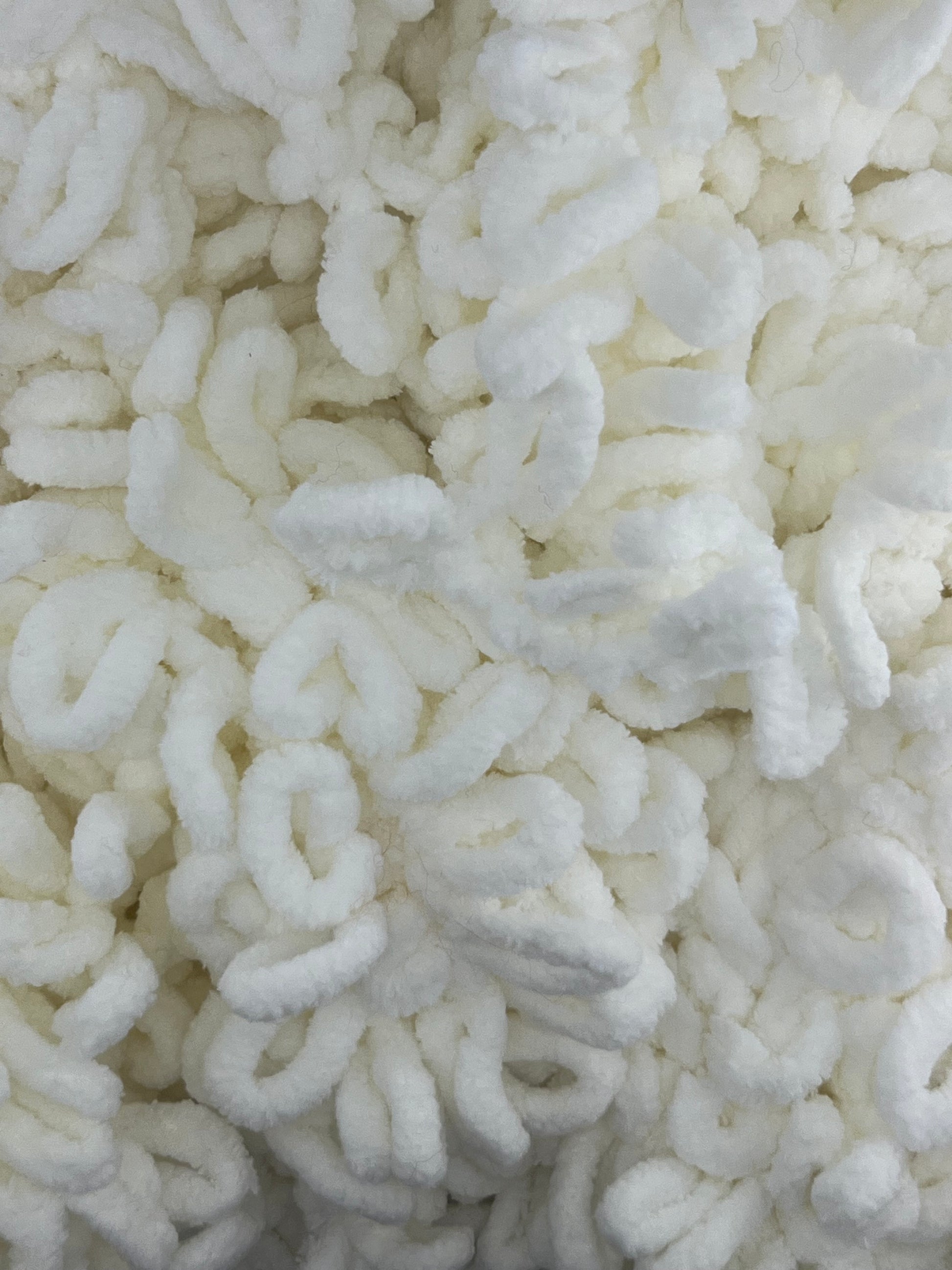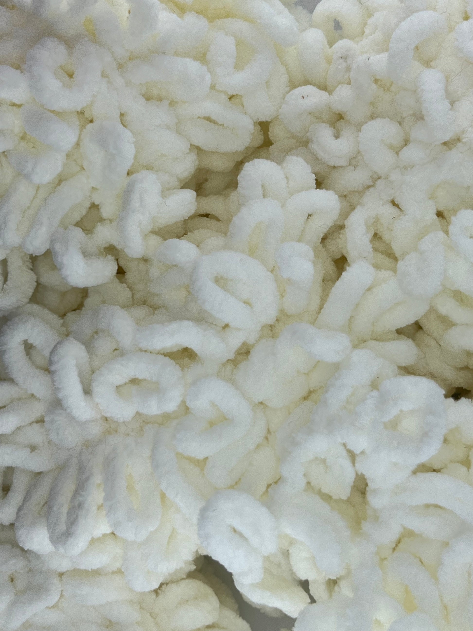 Captures the softness and fluffy texture of the yarn, evoking the gentle, cozy feel of freshly fallen snow.